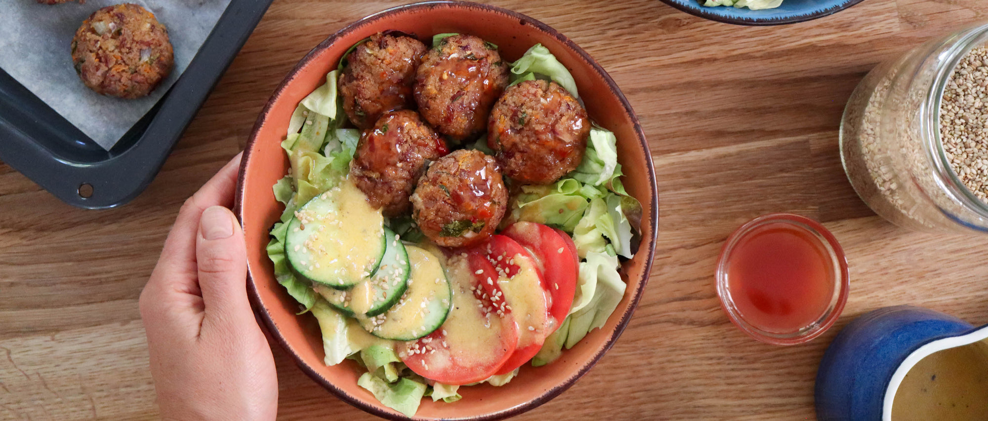 Die Bällchen am besten mit einem bunten Salat und einer leckeren Sauce servieren, zum Beispiel mit der Sweet Chili Sauce von WeltPartner aus dem claro Shop.