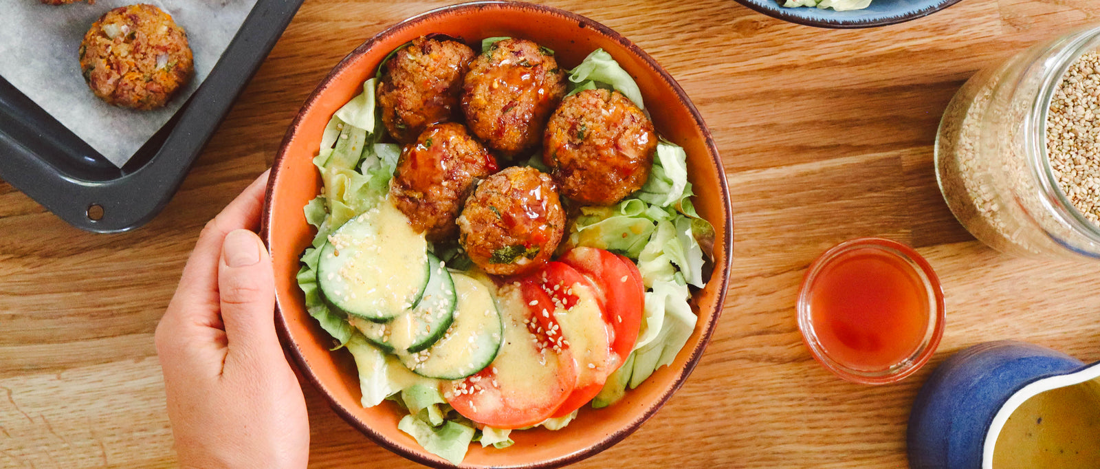 Die Bällchen am besten mit einem bunten Salat und einer leckeren Sauce servieren, zum Beispiel mit der Sweet Chili Sauce von WeltPartner aus dem claro Shop.