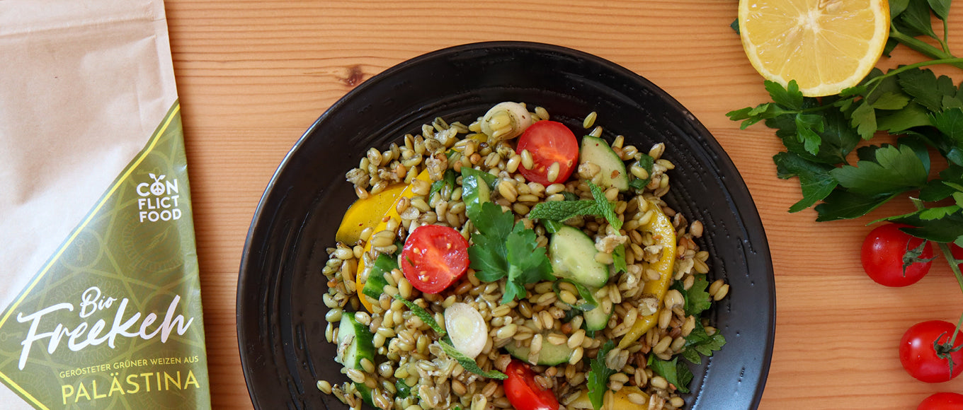 - Laver le freekeh et le faire bouillir dans une casserole avec de l'eau et du sel. Baisser ensuite fortement le feu et laisser cuire avec un couvercle pendant 30 minutes, jusqu'à ce que l'eau soit entièrement absorbée par le freekeh. Puis, mettre le freekeh dans un grand bol, le laisser évaporer et refroidir.