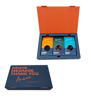 Ce coffret cadeau Amanase réunit trois sortes de délicieux chocolat bio du Ghana. Découvre un vrai plaisir qui fait de l'effet : notre coffret cadeau contient trois créations en chocolat bio fabriquées à la main - directement au Ghana, là où pousse le cacao. - Nibs de cacao - chocolat noir à 70% avec des nibs de cacao croquants et aromatiques - Macadamia Salted Caramel - nobles noix de macadamia avec du caramel salé dans du chocolat noir à 80% - Coconut Bites - fourrage exotique à la noix de coco, doublement enrobé de chocolat corsé à 80% Toutes les variétés sont végétaliennes, biologiques et produites de manière équitable - pour un plaisir conscient et un avenir durable.