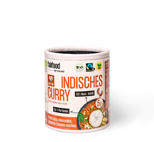 Le mélange de noix épicé et intense pour la préparation d'un curry végétalien à base de noix de cajou grillées du Burkina Faso, aromatisé avec un délicieux mélange d'épices au curry. Préparation : Cuire 400g de riz séparément. Verser 140g de curry de noix avec env. 400ml de lait de coco crémeux et env. 400g de tomates hachées dans une casserole et laisser mijoter env. 5 min. Selon les goûts, la sauce peut être assaisonnée d'un filet de jus de citron vert et des morceaux de légumes peuvent être ajoutés à la cuisson. Servir avec le riz. Suffit pour 4 portions au maximum.