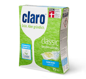 Generell sind Tabs so konzipiert, dass sie sich Schicht für Schicht auflösen. Bestimmte Enzyme und Wirkstoffe beseitigen zuerst den hartnäckigen Schmutz, die übrigen Stoffe entfalten nach und nach ihre Wirkung. Bei den claro Classic Tabs haben wir ganz genau geplant, in welcher Reihenfolge das beste Ergebnis erzielt wird. Jedes einzelne Tab wartet in unserer praktischen wasserlöslichen Folie auf seinen großen Auftritt. Und wie jedes gute Bio-Spülprodukt haben auch unsere Classic Tabs noch nie Chlor oder Phosphate gesehen. Gerade deshalb wurden sie sowohl mit dem österreichischen Umweltzeichen, als auch mit dem EU Ecolabel ausgezeichnet. Mehr lesen...