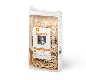 Der Hartweizen für die Girolomoni-Teigwaren wird ausschliesslich von Kleinbauern angebaut. Um alle Nähr- und Geschmacksstoffe im Getreide zu erhalten, erfolgt die Trocknung langsam und schonend bei niedrigen Temperaturen. Die Bronze Teigwaren haben eine aufgeraute Struktur und nehmen so mehr Sauce und den Geschmack besonders gut auf.