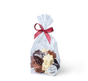 Himmlische Schokolade gefüllt in weihnächtliche Sternenform. Gemischt mit weisser, brauner und dunkler Schokolade. Ideal als besonderes Geschenk oder als Tischdekoration.